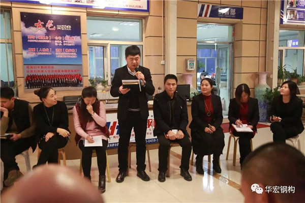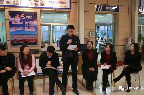 2016年12月15日15時,華宏鋼構(gòu)2016年度十大標兵評選會議在公司總部陽光大廳召開,會議由行政**經(jīng)理李德偉主持,朱宏志、朱宏勇、劉肖、張章、高霞、林春、潘宏娟、崔鳳蘭、王學東、王天宇、徐海峰、孫曉麗、苑孝南、張雪立、牟桂梅、周立彬、牟永平、王忠明、劉文舉、趙影、朱宏基等人參加了會議,同時會議還邀請了各車間和辦公室基層家人列席了會議。