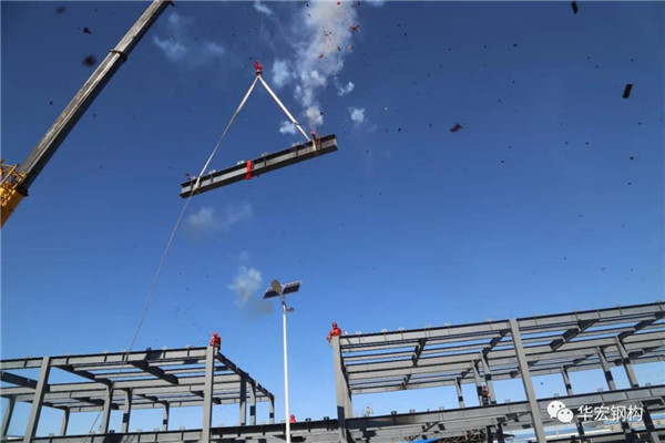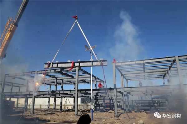 2021年4月3日,8點58分,萬里晴空,施工現(xiàn)場鞭炮齊鳴、掌聲雷動,在華宏人共同見證下,寒地裝配式鋼結(jié)構(gòu)建筑—員工公寓主梁吊裝成功,標志著工程鋼結(jié)構(gòu)主體順利完成,這也是工程項目建設(shè)開工以來取得的階段性成果。