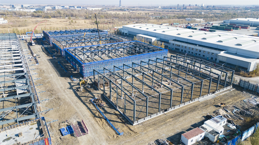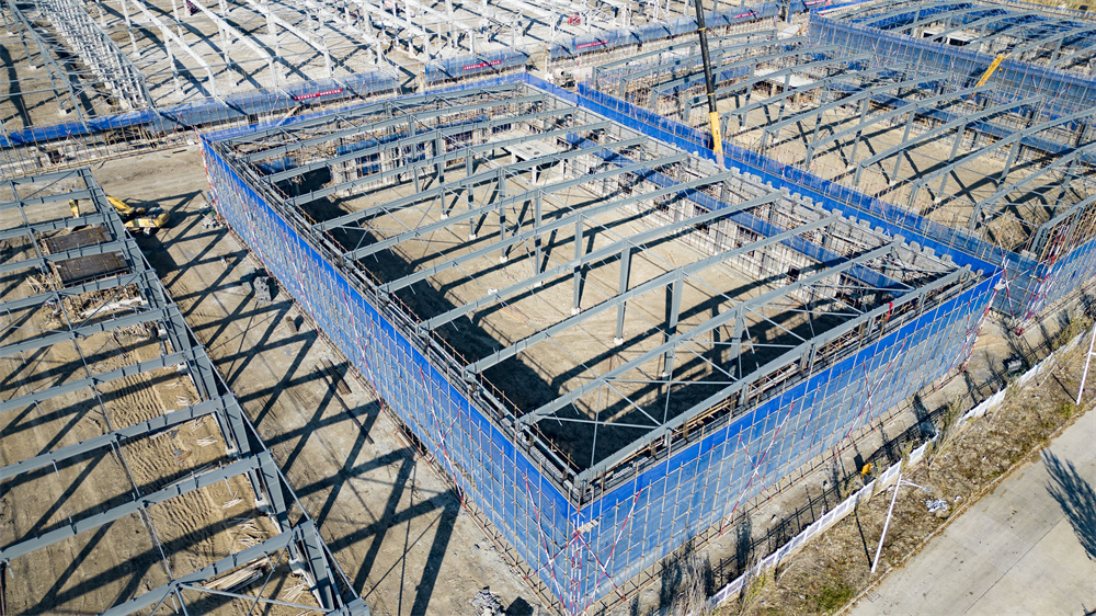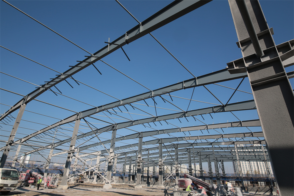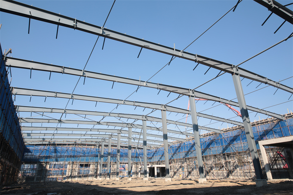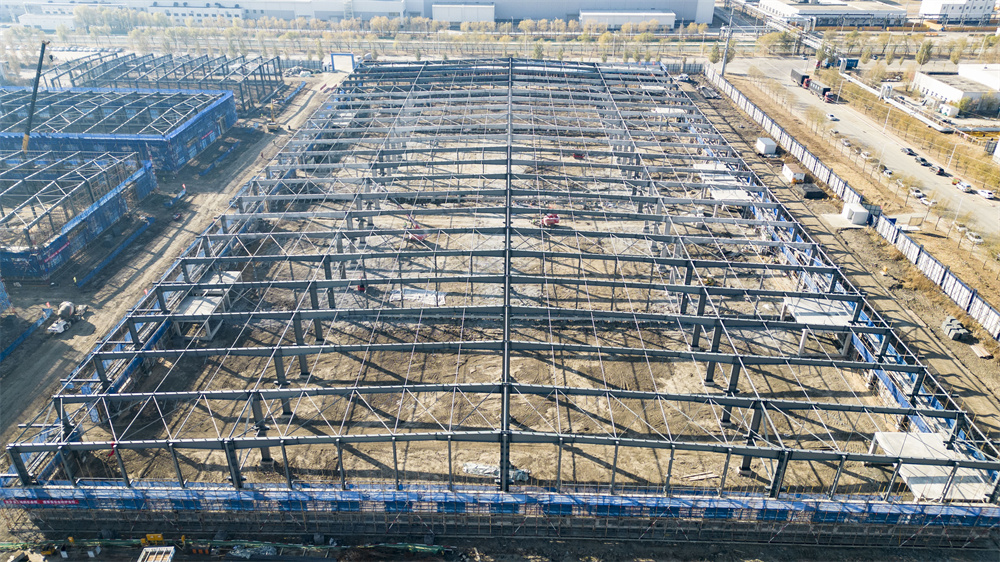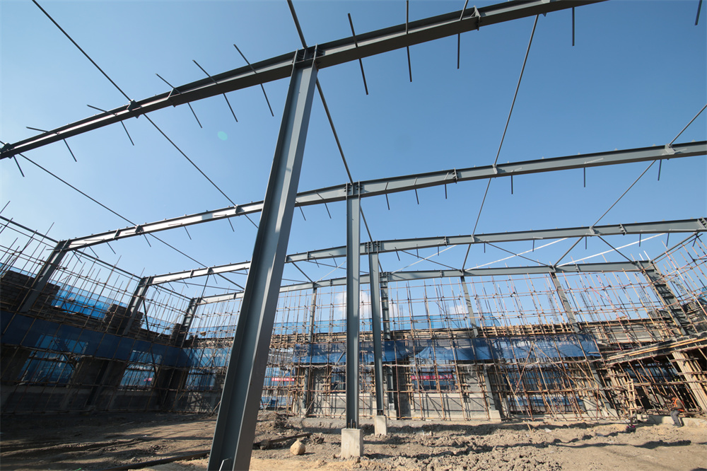 項(xiàng)目特點(diǎn):該項(xiàng)目共計(jì)分為5個(gè)單體,*大單體建筑面積為24772.11㎡。*大單體長度為207.6m、寬度108m、高度10.2m。*大單體共計(jì)布置16臺(tái)吊車,屋面設(shè)置多條電動(dòng)采光天窗。兩側(cè)縱墻分別縣挑5m寬雨棚,雨棚長度198m。該項(xiàng)目外墻均為土建外墻,鋼柱與士建外墻連接節(jié)點(diǎn)復(fù)雜,增加車間的制作難度。